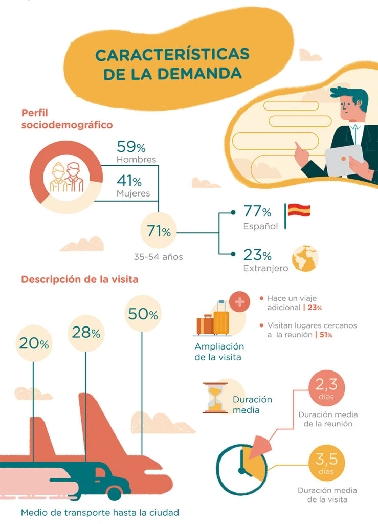 En lo que respecta a la visita, el 22,8% realiza un viaje adicional a lugares cercanos al destino donde se celebra la reunión. El 51,3% viaja por la Comunidad donde el evento ha tenido lugar, el 26,4% por otros destinos españoles y el 22,3% elige destinos europeos.